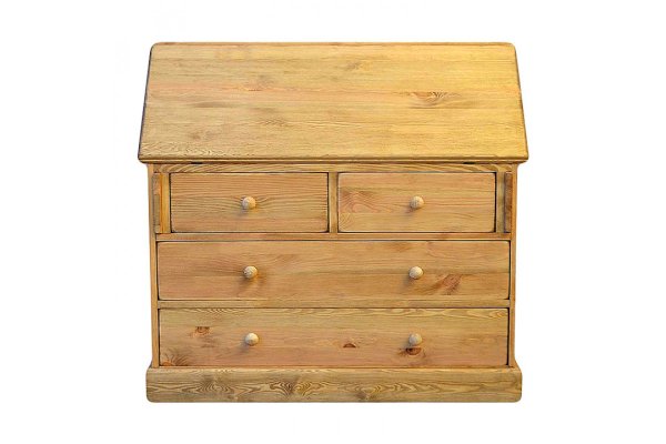 Комбинированная конструкция классического типа. Имеет откидную панель. За ней находятся открытые отсеки и два ящика. В нижней части секретера расположены два широких и два узких ящика.