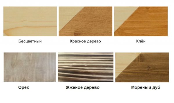 Цвета на выбор: бесцветный, клён, орех, красное дерево, морёный дуб, жженое дерево.