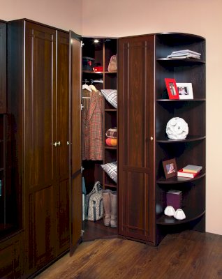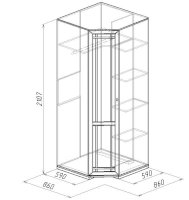 Используйте углы в комнате рационально! Угловой шкаф оснащен стационарной штангой длиной 81 см, полочками для белья и автоматической подсветкой, которая включается, если шкаф открыт. Фасад углового шкафа изготавливается только в исполнении «левый» (определяется по расположению петель). По своим габаритам угловой шкаф подходит для компоновок глубиной 590 мм.