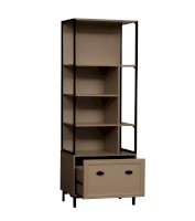 Корпус стеллажа выполнен из ЛДСП и металлического профиля. Металлическая ручка-ракушка с матовой поверхностью проста в установке, надежна и удобна в использовании, и к тому же, имеет прекрасный внешний вид. Фасады вкладные с рамочным профилем собственного производства. Опоры стеллажа визуально неотличимы от металлических, но выполнены из пластика, что облегчает вес модуля в целом.
