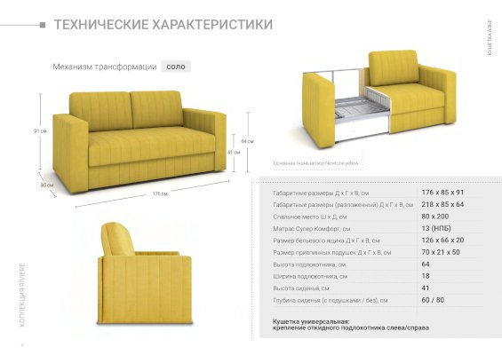 Наличие универсального направления трансформации механизма позволяет в любой момент изменить внешний вид кушетки. Откидной подлокотник может крепиться с левой или правой стороны на выбор. Допустимая нагрузка на спальное место 120 кг.