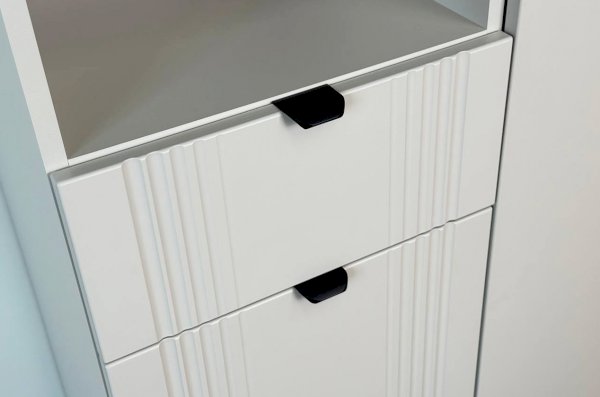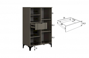 Дизайн комода продуман до мелочей: с одной стороны расположена глухая дверца, за которой скрывается просторное пространство для хранения. С другой стороны – ниша с открытой полкой, выкатной ящик и ещё одна глухая дверца, что позволяет гибко организовать хранение и поддерживать порядок в доме.