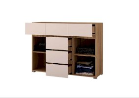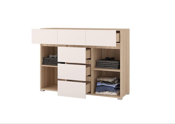 Отсутствие ручек является особенностью серии "Анталия", что придает современный и лаконичный внешний вид. В состав гостиной "Анталия" входит вместительный шкаф, а добавив комод можно получить еще больше места для хранения.