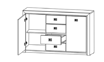 Тумба состоит из двух отделений за распашными дверями и отделения с четырьмя выдвижными ящиками. В отделениях за распашными дверями имеются вкладные полки