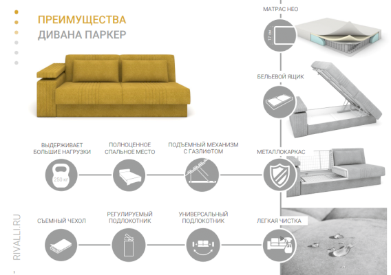 Диван Паркер с одним универсальным подлокотником, который можно фиксировать в 7 разных положениях, отличная альтернатива кровати. В основе дивана – высокий матрас с анатомическим эффектом на основе мультизонального блока независимых пружин и слоя инновационного нетканого материала Skyfiber повышенной комфортности. Механизм трансформации матрикс, позволяет раскладывать диван одной рукой.