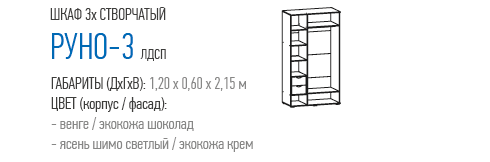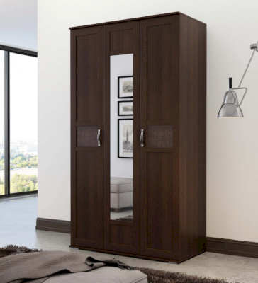 Трехстворчатый шкаф распашной «Руно-3» — эталон безупречного вкуса! Он смотрится благородно и презентабельно. Эффект элитарности достигается за счет высокого качества и особой фактуры отделки. Ламинированная ДСП оттенка венге выглядит как настоящий массив дерева. Глубокий коричневый цвет и древесная текстура создают ощущение комфорта и благополучия.